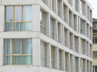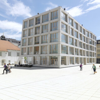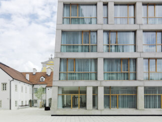 Die beiden barocken Häuser wurden rückgebaut und revitalisiert bzw. ergänzt und beherbergen nun Langzeitapartments, ein Restaurant und Seminarräumlichkeiten. Das neue Hotel ist ein selbstbewusster, skulpturaler Solitär, der einerseits auf die Lage und die Höhenentwicklung der