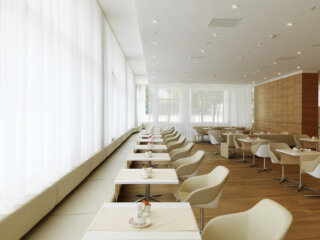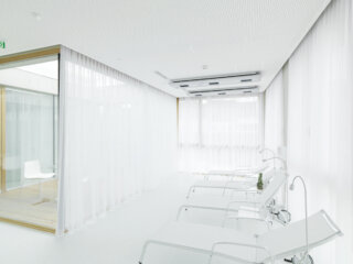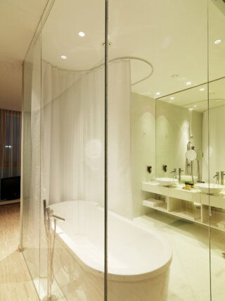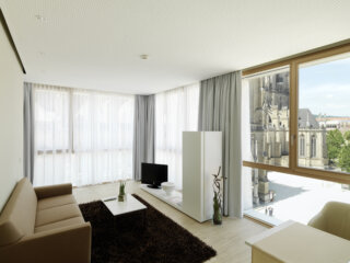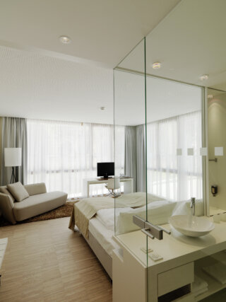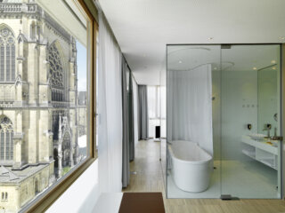 vermieden werden und das Thema der Transparenz und Offenheit sich auch im Inneren wiederfindet. Die Zimmer selbst sind großzügig und luftig, raumhohe Glaswände stellen einen engen Kontakt zum Dom und zur unmittelbaren Umgebung her.