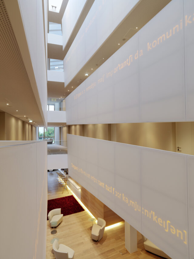 benachbarten Bebauung reagiert, andererseits eine Antwort auf die zugleich filigrane und dominante Baustruktur des Domes ist. Der Baukörper „schwebt“ über dem Platz, seine Masse wird in einer Betongitterstruktur aufgelöst, seine plastische Ausformung – Fassadenknicke und eine Verjüngung nach oben hin – knüpft an die Gestaltung des Domchores an und unterstreicht die kleinteilige Ensemblewirkung mit den barocken Bestandsgebäuden. Ein trichterförmiges, von oben belichtetes Atrium durchschneidet den Hotelkörper, wodurch enge, dunkle Gangsituationen