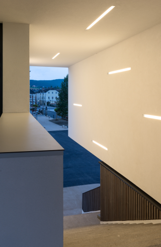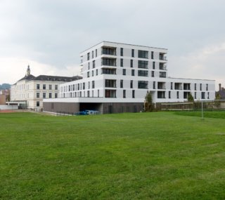 Als Reaktion auf das sehr selbstbewusste Schulgebäude schien es uns sehr wichtig auch wieder ein Solitärbauwerk, das allerdings vermittelt zwischen dem mächtigen Bestandsbaukörper und den meist 3-geschossigen Bebauungen in der St. Peter Straße, zu setzen.