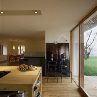 Als wichtigster Eingriff wurden die beiden Bestandsgebäude durch einen neuen, hohen und luftigen Wohnraum miteinander verbunden. Ausgehend von diesem Gelenk wurde ein zusammenhängendes, offenes Gefüge entwickelt, das durch Nischen bzw. Einbauten in unterschiedliche Zonen gegliedert ist. Kochen und Essen finden im ehemaligen Wohnhaus statt, Schlafzimmer und alle zugehörigen Funktionen sind im vormaligen Wirtschaftstrakt untergebracht, wobei die durchgehende Offenheit – sowohl in den Innenhof als auch in der räumlichen Abfolge - ein maßgeblicher Wunsch der Bauherren war.