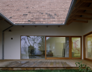 Zuletzt wird der U-förmige Grundriss mit einem klimatisch nicht abgeschlossenen Raum zum „Sommerwohnraum“ vervollständigt. Hier, wie im gesamten Haus, wurde größter Wert auf Aussicht, auf bewusst gewählte Blickverbindungen und einen starken Bezug zum Außenraum gelegt. Sowohl vor dem Haus als auch im Innenhof gibt es durch Holzroste definierte Bereiche für das Leben draußen, das den Bauherren immer wieder ein hervorgehobenes Anliegen ist. Im Inneren wurde eine möglichst zurückhaltende Farb- und Formgebung praktiziert, um der Kunstsammlung der Besitzer einen entsprechenden Hintergrund zu bieten. Wenige, haptisch anspruchsvolle und im Kontext stimmige Materialien wie Kalkputz, Lärchenholz oder Gussestrich kamen zum Einsatz und erzeugen im Zusammenspiel mit dem fließenden Raum- und Lichteindruck eine Atmosphäre nicht des luxuriösen, sondern des stimmungsvollen Wohnens.