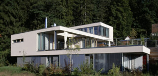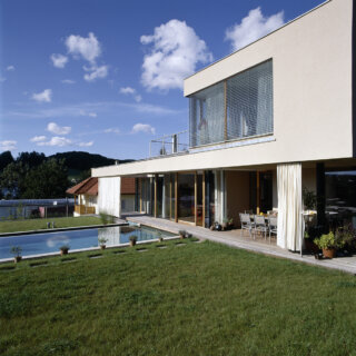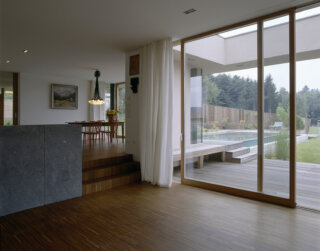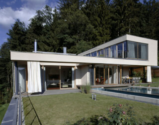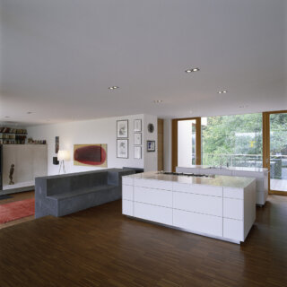 Angrenzend an einen Waldrand in Graz, schlingt sich das Einfamilienhaus mit einer Einliegerwohnung in Form eines weißen Bandes den Nordwesthang hinab. Der Entwurf hat die Umfaltung von Innen und Außen zum Thema. Vom zentralen Raum der Küche aus entwickeln sich alle im Leben der Bauherren wichtigen Räume. Durch das Spiel mit Vor- und Rückspringen vom strukturierenden Band wird ein fließendes Raumgefüge geschaffen, das den Außenraum in das Haus mit einbindet. Um die zentrale Küche im Erdgeschoss gruppieren sich frei der Schlafbereich mit Bad und Schrankraum, der offene Wohnraum mit Bibliothek, der Essbereich an den im Garten der Pool vorgelagert ist und der Wirtschaftsbereich mit Arbeits- und Abstellräume.