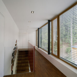 Drei separate Raumeinheiten für die Kinder reihen sich im Obergeschoss gleichberechtigt an die großzügige Dachterrasse und bilden somit einen eigenständigen Jugendbereich mit freier Aussicht auf das Grazer Umland. Im Untergeschoss ist, völlig unabhängig zugänglich, eine 3-Zimmerwohnung untergebracht. Durch die Terrassierung des Hanges wird ein ungestörtes Miteinander der Bewohner am Grundstück möglich.
