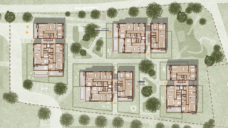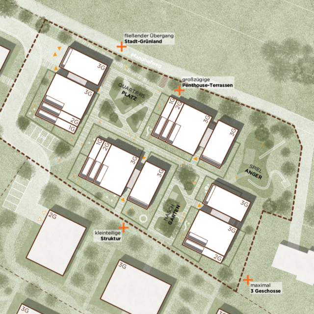 Die Baukörper sind zu überschaubaren Nachbarschaften angeordnet. Dazwischen entstehen Gemeinschaftsflächen, Plätze und grüne Fugen. Die dreigeschossigen 3-Spänner folgen einer klaren Statik – effiziente Grundrisse, kurze Wege.