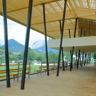 Wie schon in Stattegg beruht der Entwurf für das Sportstadion Bad Aussee auf zwei Grundgedanken: Erstens wird eine wirtschaftliche, organisatorisch und energetisch optimierte Lösung auf der Basis von Holzmodulbauteilen angestrebt, zweitens soll die Anlage nicht nur für Fußballspiele, sondern auch für andere Vereine und gesellschaftliche Veranstaltungen innerhalb der Dorfgemeinschaft geeignet sein. Die spezielle Topografie – das Grundstück liegt auf einer Insel, die von zwei Flussarmen der Traun und einem Bach gebildet wird – bildet den äußeren Rahmen für den Entwurf, der die Anlage als Flussverbau interpretiert: Auf einer massiven Platte unter einem frei geformten, kräftigen Dach, das als Reaktion auf die umgebende Berglandschaft verstanden werden kann, sitzt ein zurückhaltender Baukörper. Im Sockelgeschoss befinden sich Sportlerkabinen und Technikräume, darüber, auf der Platte, Tribünenzugang, Gastronomie, Clubraum und Toilettenanlagen.