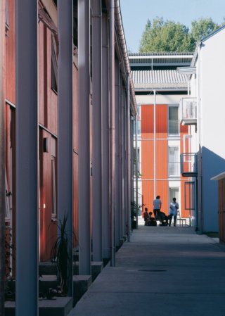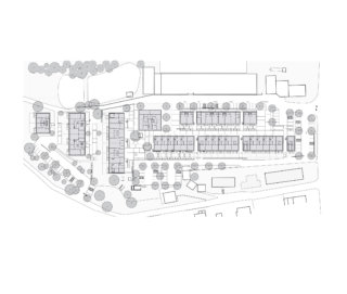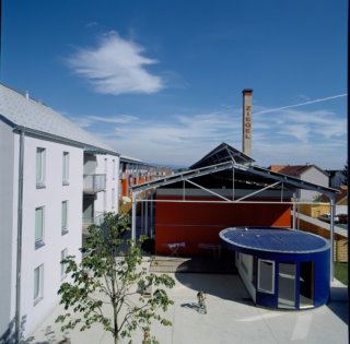 Die ursprüngliche Struktur der Anlage blieb bestehen, Durchgänge, Wege und Plätze zwischen den Baukörpern erzeugen ein urbanes, lebhaftes Ambiente, das durch die unterschiedlichen Haustypen betont wird. Zentrum ist ein dreigeschossiger, verputzter Solitär in dem sich Seniorenwohnungen befinden. Er wurde ebenfalls in Holzbauweise errichtet und entspricht in Lage und Proportion dem ehemaligen Knethaus der Ziegelei. Die Grundrisse wurden ausgehend von den Achsabständen der vorhandenen Stahlträger entwickelt, zweiseitig orientiertes Wohnen sowie der Kontakt zum Außenraum waren wichtige Parameter für die Geschoss- und Maisonettenwohnungen. Stiegenhäuser, Laubengänge und Terrassen werden über Sekundärkonstruktionen vom Hallenstahlskelett getragen, zwischen und neben den Baukörpern befinden sich Abstell- und Kellerersatzräume aus Holz, eine niedrigere Halle an der Nordseite des Areals dient als Autoabstellplatz.