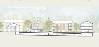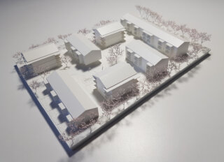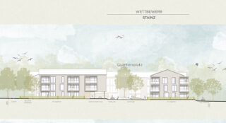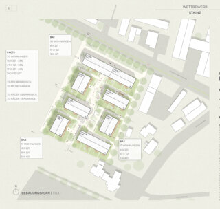 Ziel dieses Entwurfs ist es mit einem offenen Netzwerk aus zueinander gruppierten Bauvolumen die Ortskultur behutsam zu erweitern. Klare und einfache Gebäudetypen werden zu Höfen gruppiert. So entsteht ein offenes Geflecht mit vielen differenzierten Raumfolgen von öffentliche über halböffentlich, sowie privat. An der Engelweingartenstraße wird mir einem langgestreckten Baukörper auf die befahrene Straße im Norden reagiert, gleichzeitig bleibt jedoch mit einem großzügig geöffneten Erdgeschoss die Bebauung offen und durchlässig und formuliert ein Entree in den neuen Wohnpark. Am Bauplatz werden insgesamt 70 Wohnungen in 7 Häusern konzipiert. Diese können in 3 Bauabschnitten errichtet werden. Die Wohnanlage organisiert sich entlang einer zentralen internen Erschließungsspange – dem „Quartiersplatz“, der das Wohnquartier durchzieht und eine halböffentliche Spange von der Hauptstraße bis nach Süden aufspannt. Der Corso stellt das Zentrum der Wohnanlage dar und ist fußläufiger Erschließungs- und Kommunikationsraum. 2 Haustypen gruppieren sich und durch die Gebäudestellung werden hofartige Freiräume gebildet. Gleichzeitig wird durch die Baukörperstellung eine optimale Besonnung und gute Aussichten für alle Wohnungen erreicht.